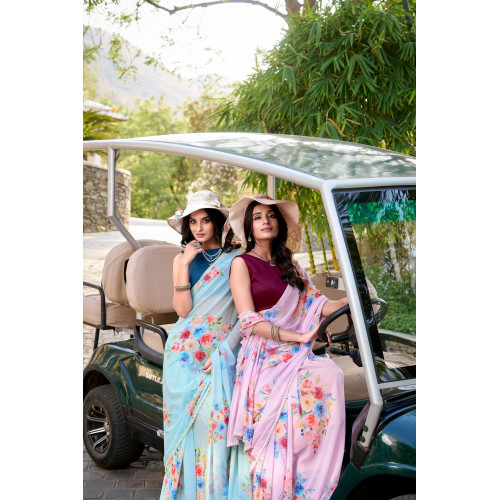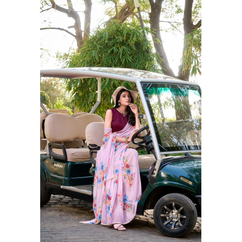 Light Pink Floral Printed With Pearl Lace Border Saree