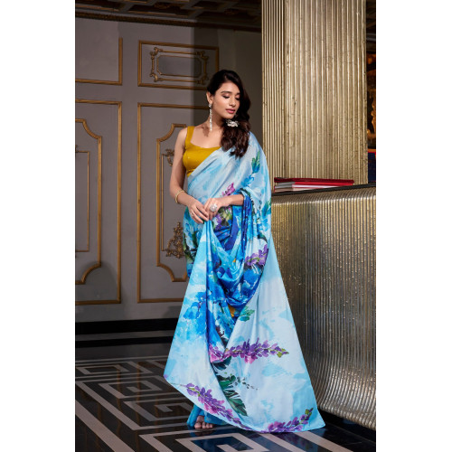 Sky Blue Satin Silk Digital Printed Saree