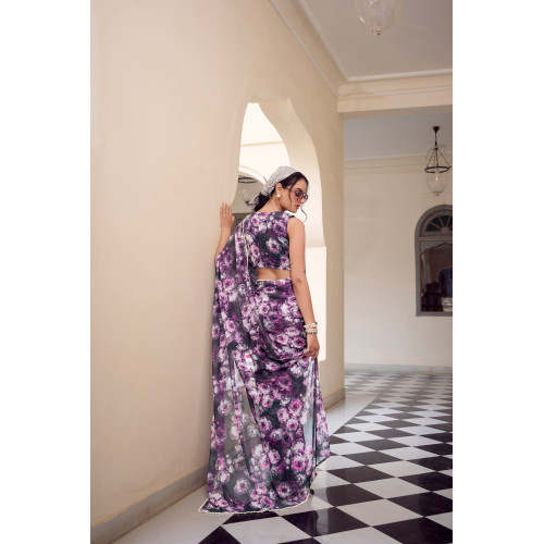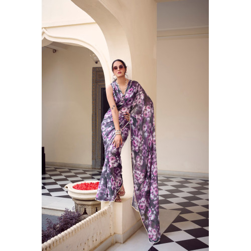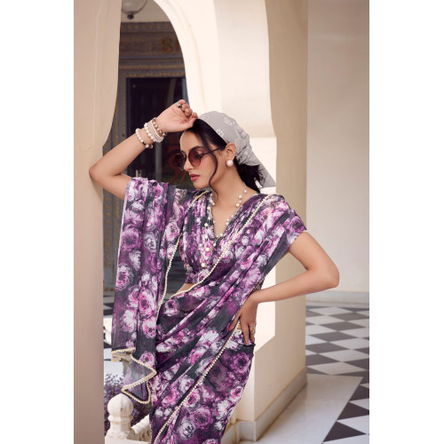 Grey and Purple Floral Printed With Pearl Lace Border Saree