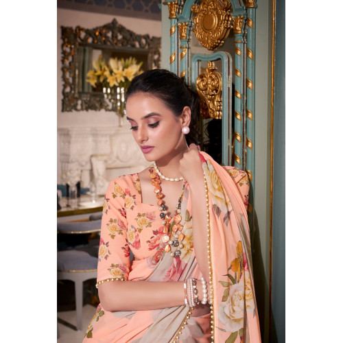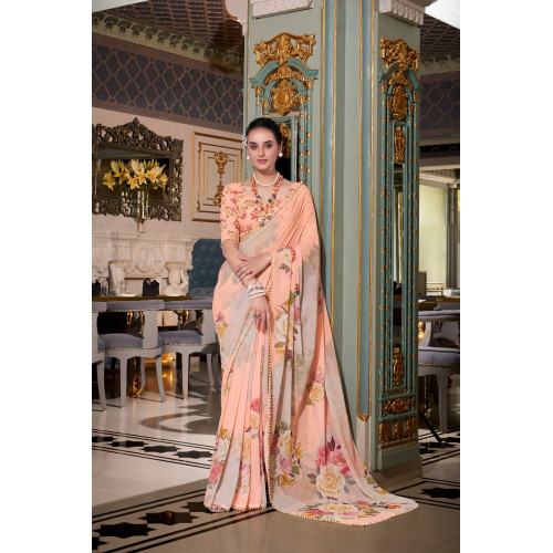 The best way to represent your classy look with this spectacular georgette printed saree with Pearl lace border.
